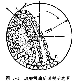 磨碎礦石通常是在磨礦機(jī)中進(jìn)行的。磨礦機(jī)有各種不同的型式,仍在磨碎有色金屬及黑色金屬礦石時(shí),目前我國(guó)只用球磨機(jī)和棒磨機(jī)。球磨機(jī)和棒磨機(jī)是一個(gè)兩端具有空軸的回轉(zhuǎn)圓筒,筒內(nèi)裝入相當(dāng)數(shù)量的鋼球或鋼棒。礦石和水從一端的中空軸給入圓筒,從另一端的中空軸排山。當(dāng)圓筒按規(guī)定的速度回轉(zhuǎn)時(shí),磨礦介質(zhì)(鋼球、鋼棒)在筒內(nèi)可作拋落運(yùn)動(dòng)和滑動(dòng),使礦石受到?jīng)_擊和磨剝作用而被磨碎。磨碎了的礦石與水形成礦漿(濕式磨礦),由排礦端的中空軸排出。磨礦機(jī)磨礦過(guò)程中鋼球的運(yùn)動(dòng)情況如圖5-1所示。