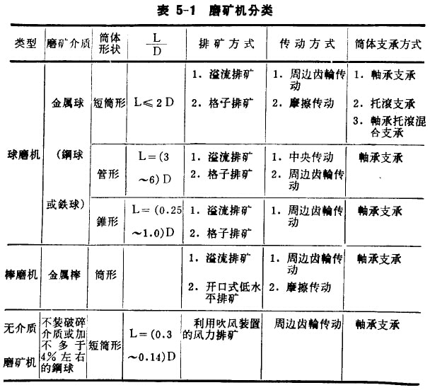 磨礦機(jī)通常根據(jù)磨碎介質(zhì)、機(jī)殼形狀和排礦方法進(jìn)行分類(lèi)。一般分類(lèi)如表5-1所列。