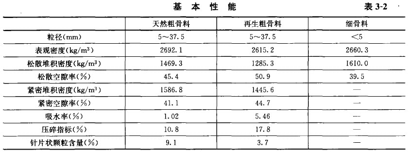 從表3-2可見,再生粗骨料中針片狀顆粒含量為3.7%,天然粗月料的針片狀顆粒含量為9.1%。骨料中的針片狀顆粒不僅本身受力時易折斷,而且含量較多時會增大骨料的空隙率,使混凝土拌羽吻和易性變差,同時降低混凝土強(qiáng)皮。因此,單就針片狀顆粒含量來說,再生粗骨料優(yōu)于天然粗骨料。