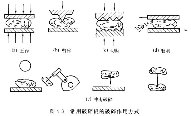 目前廣泛采用的破碎方法有沖擊破碎、剪切破碎、擠壓破碎摩擦破碎等,此外還有專用的低溫破碎、濕式破碎。常用破碎機(jī)的破碎作用方式如圖4-3所示。