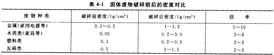 廢物經(jīng)錘式破碎機破碎以后,由于尺寸減小而密度增加。幾種固體廢物破碎前后的密度結(jié)果列于表4-1。從表中可見,破碎處理可使廢物的密度增加2-10倍。