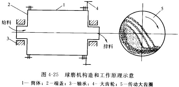 圖4-25為球磨機(jī)構(gòu)造和丁作原理示意。它由圓柱形筒體、筒體兩端端蓋、中空軸頸、軸承和傳動(dòng)大齒圈組成。在筒體內(nèi)裝有鋼球(直徑為25-150nml)。其裝入量為筒體有效容積的25%-50%,筒體兩端的中空袖頸有兩個(gè)作用:一是應(yīng)軸頸的支承作用,使球墨機(jī)全部重量由中空軸須傳給軸承和機(jī)座;二是起給料和排料的漏斗作用,電動(dòng)機(jī)通過(guò)聯(lián)軸器和小齒輪帶動(dòng)大齒圈和筒體緩緩轉(zhuǎn)動(dòng)。筒體內(nèi)壁設(shè)有襯板,侖同時(shí)起到防止筒體磨損和提升鋼球的作用。當(dāng)筒體轉(zhuǎn)動(dòng)時(shí),鋼球和破碎物料在摩擦力、離心人和襯板的共同作用下,被襯板帶動(dòng)提升。征在升到一定高度后,由于自身重力的作用處得鋼球和物料產(chǎn)土自由瀉路和拋落(圖4-26),從而對(duì)筒體內(nèi)底腳區(qū)的物料產(chǎn)個(gè)外擊和研磨作用。物料粒徑達(dá)到要求后出風(fēng)機(jī)抽出。