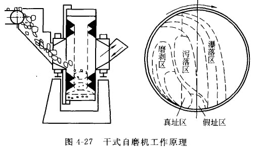 自磨機(jī)又稱無(wú)介質(zhì)磨機(jī),分干磨和濕解購(gòu)種。圖4-27所示為干式自磨機(jī)工作原理。干式自磨機(jī)由給料斗、短筒體、傳動(dòng)部分和排料斗等組成。給料粒度一般300-400mm,一次磨細(xì)到0.1mm以下,粉碎比可達(dá)3000-4000,比球磨機(jī)等有介質(zhì)磨機(jī)大數(shù)十倍。