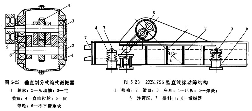DS系列直線振動(dòng)篩采用整體的箱式激振器(見圖5-20)。激振器的箱體用35號(hào)鑄俐制成。箱體內(nèi)槳有主動(dòng)軸1和從動(dòng)軸2,軸上各有一對(duì)重 量相向的不平衡員塊(偏心塊)3,皮帶輪4帶動(dòng)土軸問轉(zhuǎn),通過一對(duì)齒輪5使從動(dòng)軸做反向心同歲的回轉(zhuǎn),利用個(gè)平衡玉回轉(zhuǎn)時(shí)產(chǎn)生的離 心力使激振器產(chǎn)牛定向的激扼力。該激振器具有以下結(jié)構(gòu)特點(diǎn)。①平衡重塊成對(duì)地布量在激銀器箱體外面。這樣可使箱內(nèi)結(jié)構(gòu)緊湊;便 于調(diào)整不平衡重塊上面的配重柱塞,以改變篩稻的振幅;同時(shí),也避免不平衡重塊回轉(zhuǎn)時(shí),碰擊箱體內(nèi)的潤(rùn)滑油而引起箱體發(fā)熱。齒輪 對(duì)安裝在箱體內(nèi),使其潤(rùn)滑可靠,傳動(dòng)平穩(wěn)。②制成整體式,沒有別分面,在承受激振力時(shí)較合理,制造簡(jiǎn)單,但拆裝困難。