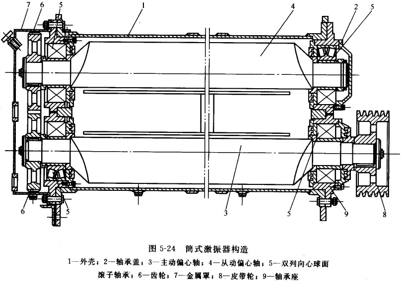 座式直線振動(dòng)篩采用筒式激振器,其構(gòu)造如圖5-24所示。在帶三角形側(cè)板的扁圓筒形外殼1上裝有軸承座9,兩根偏心軸3、4通過一對(duì)雙列向心球面滾子軸承5安裝在軸承座上。皮帶輪8帶動(dòng)主動(dòng)偏心軸3并經(jīng)一對(duì)齒輪6使從動(dòng)偏心軸4做反向同步回轉(zhuǎn),從而產(chǎn)生定向的激振力。在一對(duì)齒輪6一側(cè)有金屬罩7,內(nèi)裝潤(rùn)滑油,用以潤(rùn)滑齒輪和同側(cè)的該動(dòng)軸承。皮帶輪側(cè)的軸承各成封閉油腔,采用潤(rùn)滑脂潤(rùn)滑。齒輪側(cè)的波動(dòng)軸承和皮帶輪側(cè)的滾動(dòng)軸承采用迷宮式密封。激振器通過螺栓固定在篩箱上,并用鉸孔螺栓定位。