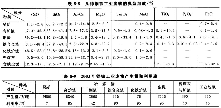 隨著鋼鐵工業(yè)的蓬勃發(fā)展,近幾年我國鋼鐵產(chǎn)量已穩(wěn)居世界首位,2003年我國鋼產(chǎn)量已達到2.2億噸,接近世界總產(chǎn)量的20%;但同時也排放了約1.7億噸的廢物,包括開采廢石、選礦尾礦、高爐渣、鋼渣、鐵合金渣、含鐵塵泥、粉煤灰等,其典型組成如表8-8所示。