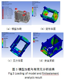 對機架的模型進行靜力學(xué)求解,機架結(jié)構(gòu)約束、加載應(yīng)力變形和安全系數(shù)圖如圖3所示: