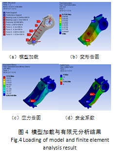 前處理結(jié)束后,對動顎的模型進行靜力學(xué)求解,動顎結(jié)構(gòu)約束與加載應(yīng)力變形和安全系數(shù)圖如圖4所示: