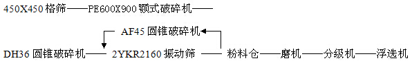 現(xiàn)針對云南銅礦的技術(shù)改造升級及圓錐破碎機(jī)在銅礦中的應(yīng)用進(jìn)行一個分析比較。原來工藝流程為:450X450格篩——PE600X900顎式破碎機(jī)——DH36圓錐破碎機(jī)——粉料倉——磨機(jī)——分級機(jī)——浮選機(jī),由于原來DH36圓錐破碎機(jī)為中碎圓錐機(jī),在此處作為最終碎礦作業(yè),碎礦成品粒度在40mm以下,以此成品做為磨機(jī)的粉礦原料,從磨礦追求的“多破少磨”的碎礦理念來講,明顯是很不明智的,使得整個選礦能耗大大增加。原來設(shè)計(jì)流程,一次投入較小,短期內(nèi)見效快。但對于長期運(yùn)行,磨機(jī)耗電量和球磨介質(zhì)鋼球磨損來看,進(jìn)入磨機(jī)的礦石從小于40mm,磨到85%-200目以下,明顯運(yùn)行成本太高。對于當(dāng)今礦石品位越來越低來講,企業(yè)會感覺成本太高,所以技術(shù)升級改造也是迫在眉睫。