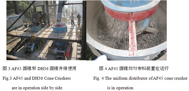進(jìn)入粉礦倉的原料為10mm以下。改造后兩臺圓錐并排使用如圖3。