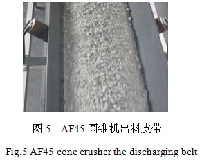 經(jīng)現(xiàn)場積滿給料如圖4,出料如圖5,經(jīng)過測試,AF45圓錐破碎機(jī)排料口設(shè)定在25mm時,通過能力為295噸/小時,出料中12mm以下占52%,這樣算來12mm以下153.4噸/小時,大于樣本中13mm以下105噸/小時,所以AF45圓錐從產(chǎn)能和生產(chǎn)指標(biāo)完全達(dá)到并超過設(shè)計(jì)參數(shù)。