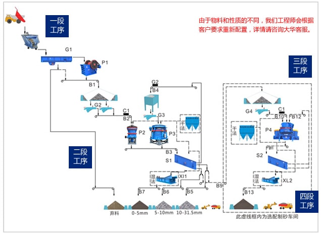 花崗巖大塊物料經(jīng)料倉(cāng)由振動(dòng)給料機(jī)均勻喂料,輸送到顎式破碎機(jī)進(jìn)行粗碎,粗碎后的物料經(jīng)振動(dòng)篩篩分后,由皮帶輸送機(jī)輸送至反擊式破碎機(jī)或圓錐破碎機(jī)進(jìn)行中細(xì)碎。