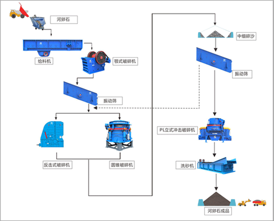 玄武巖大塊物料經(jīng)料倉由振動(dòng)給料機(jī)均勻喂料,輸送到顎式破碎機(jī)進(jìn)行粗碎,粗碎后的物料經(jīng)振動(dòng)篩篩分后,由皮帶輸送機(jī)輸送至反擊式破碎機(jī)或圓錐破碎機(jī)進(jìn)行中細(xì)碎。