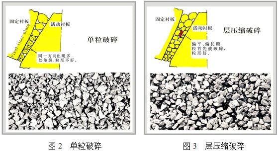 一般型號的設(shè)備為了得到較小的產(chǎn)品得把排料口調(diào)整得較小或利用特殊形狀的腔形,此種破碎是一個個的單粒直接壓縮的破碎方式,其結(jié)果是破碎機能力不能充分發(fā)揮,另外也因原料的負荷變動、水分等影響性能受明顯影響,造成通過量小,細粒的生產(chǎn)量也小,偏平偏長的產(chǎn)品多粒形不好(圖2),產(chǎn)品強度低,機械負荷大,機械的耐久性不好,有時不能平穩(wěn)運轉(zhuǎn)。為了從根本上解決問題,破碎機改變了細碎的概念:加大排料口間隙,即使出口間隙大,只要滿足適當壓縮的做功條件,就有可能生產(chǎn)出更多的細粒產(chǎn)品。實現(xiàn)層壓縮破碎的設(shè)備出口間隙大并利用特殊的破碎腔形成復數(shù)的粒子層、提高破碎腔內(nèi)的巖石密度、將破碎能量充分加給巖石,以達到破碎的目的(圖3)。為了實現(xiàn)層壓縮破碎,均勻布料裝置不可缺少,以防止原料粒度偏析、達到穩(wěn)定運轉(zhuǎn),破碎壁與軋臼壁磨損均一,零部件壽命長;為了實現(xiàn)層壓縮破碎,自動控制系統(tǒng)也不可缺少,該系統(tǒng)隨時監(jiān)視液壓系統(tǒng)的壓力值、主電機的電流值及料位,根據(jù)負荷條件自動調(diào)整排料口間隙,以便能在最大負荷下運轉(zhuǎn),獲得更大的產(chǎn)量及更好的粒形(圖4)。單粒破碎一般等于排料口尺寸的產(chǎn)品產(chǎn)量約占通過量的50%,層壓縮破碎一般等于排料口尺寸的產(chǎn)品約占通過量的70-80%(圖5)。