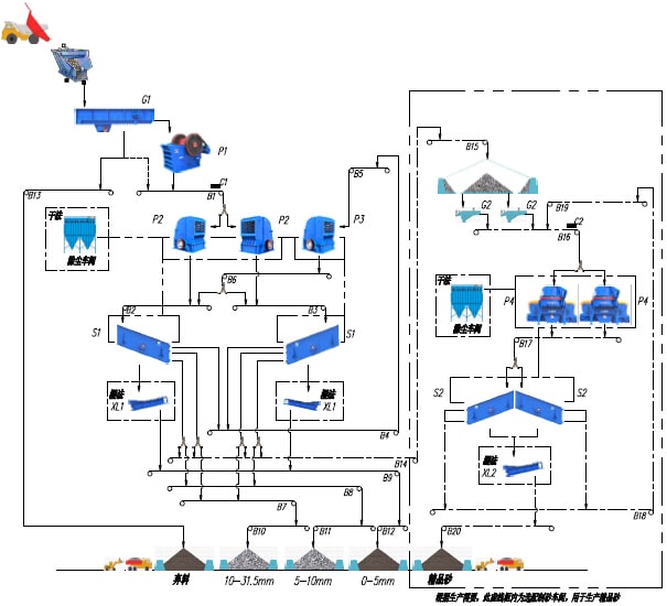 800t/h---石灰石(白云巖)類巖石的砂石骨料生產(chǎn)工藝流程示意圖