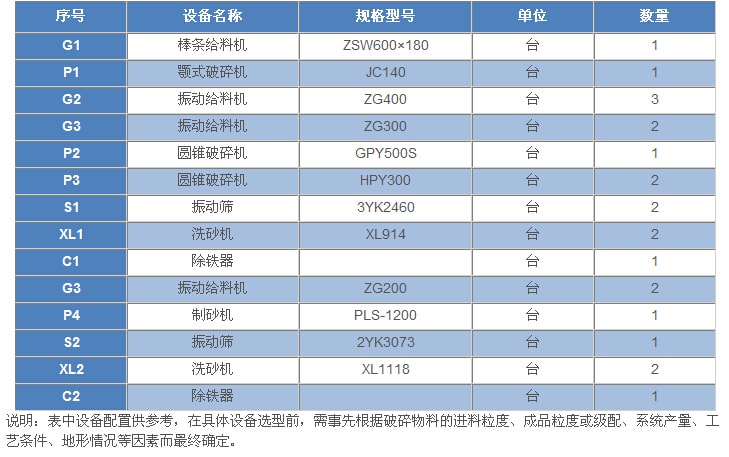 600t/h---花崗巖(玄武巖)類巖石的砂石骨料生產(chǎn)工藝設(shè)備配置表
