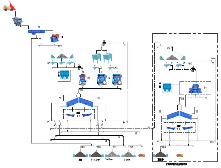 根據(jù)工程的需要,該系統(tǒng)也可以配置制砂系統(tǒng),用于生產(chǎn)合理級(jí)配的精品砂(如虛線框內(nèi)所示),當(dāng)需要生產(chǎn)精品砂時(shí),可以從一篩篩分車間篩分后分離出5-40mm的混合物料通過(guò)皮帶機(jī)輸送至制砂車間的半成品料倉(cāng),再通過(guò)振動(dòng)給料機(jī)將物料均勻的給至制砂機(jī),經(jīng)過(guò)制砂機(jī)破碎后的成品混合料再通過(guò)皮帶輸送機(jī)輸送至二篩篩分車間進(jìn)行篩分,從而分離出不同顆粒級(jí)別的成品。
