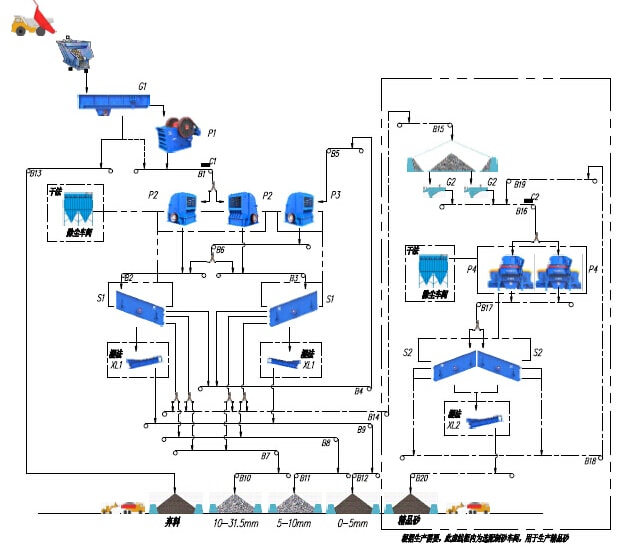 該生產(chǎn)線(xiàn)生產(chǎn)工藝適用于產(chǎn)量600t/h噸石灰石(白云巖)類(lèi)中等以下硬度物料的加工破碎,將經(jīng)過(guò)爆破處理或開(kāi)挖洞采的毛料通過(guò)棒條給料機(jī)均勻的供給顎式破碎機(jī)破碎,經(jīng)顎式破碎機(jī)破碎后的半成品物料通過(guò)皮帶機(jī)輸送給反擊式破碎機(jī)進(jìn)行二次破碎,經(jīng)反擊破二次破碎后的混合骨料經(jīng)過(guò)皮帶機(jī)輸送至一篩車(chē)間進(jìn)行分級(jí)篩分,篩分過(guò)后將大于用戶(hù)需要的大顆粒物料通過(guò)皮帶機(jī)輸送至細(xì)碎反擊式破碎機(jī)再進(jìn)行破碎,破碎后的物料再通過(guò)皮帶機(jī)也輸送至一篩車(chē)間進(jìn)行篩分,篩分過(guò)后的不同顆粒級(jí)別的成品通過(guò)成品出料皮帶機(jī)輸送至成品料倉(cāng)。不符合要求的大顆粒再次返回細(xì)碎反擊式破碎機(jī)進(jìn)行循環(huán)破碎。如果成品砂需要水洗也可以配置洗砂機(jī)用于成品砂的水洗,該系統(tǒng)的棒條給料機(jī)還具有預(yù)篩分功能,可以將原料中的細(xì)顆粒物料提前分離直接進(jìn)入后續(xù)的破碎設(shè)備,也可將原料中的泥土雜物作為棄料預(yù)先分離。