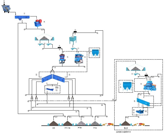 該系統示意工藝適用于時產400噸花崗巖、玄武巖類硬性物料的加工破碎,將經過爆破處理或開挖、洞采的大塊毛料通過自卸車上料至原料倉,經過具有預篩分功能的棒條給料機均勻的供給顎式破碎機破碎,經顎式破碎機破碎后的半成品物料通過皮帶機輸送給具有中細碎功能的圓錐破碎機進行二次破碎,經圓錐破碎機二次破碎后的混合成品骨料經過皮帶機輸送至后續(xù)一篩車間進行分級篩分,篩分將大于用戶需要的大顆粒物料再通過皮帶機輸送至細碎圓錐破碎機進行破碎,破碎后的物料也進入一篩車間進行篩分,滿足客戶需要的合格成品通過皮帶機輸送至成品料倉,不符合要求的大顆粒再次返回細碎圓錐破碎機進行循環(huán)破碎。如果成品砂需要水洗也可在一篩下面配置洗砂機用于成品砂的水洗。該系統的棒條給料機還具有預篩分功能,可以將原料中的細顆粒物料提前分離直接進入后續(xù)的破碎設備,也可將原料中的泥土雜物作為棄料預先分離。