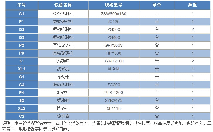 400t/h---花崗巖(玄武巖)類巖石的砂石骨料生產工藝設備配置表