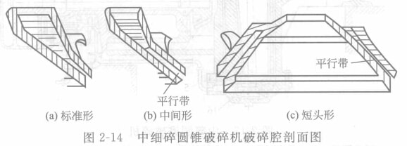 除了標(biāo)準(zhǔn)型與短頭型圓錐破碎機(jī)外,還有介于它們兩者之間的一種名為中型圓錐破碎機(jī).既可用于中碎也可以用于細(xì)碎。標(biāo)準(zhǔn)、中型、短頭圓錐破碎機(jī)的主要區(qū)則是破碎腔的斷面形狀水同。因此,給礦粒度和排礦粒度也不同。下圖表示了這三種破碎腔剖面圖。