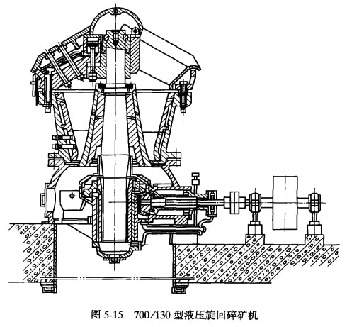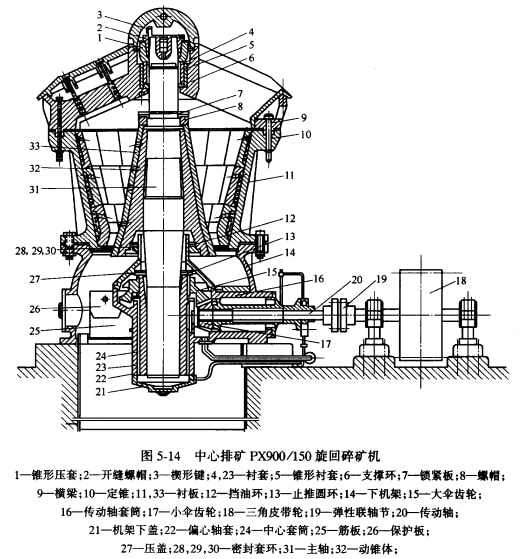 圖5-14是我國(guó)自制的PX900/150型中心排礦的旋回碎礦機(jī)。