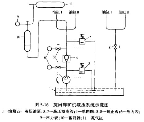 旋回碎礦機(jī)的液壓系統(tǒng),如圖5-16所示。如果非破碎物尺寸太大,不能自動(dòng)排出,當(dāng)主軸和動(dòng)錐下降到一定位置時(shí),通過安裝在主軸上部的自整角發(fā)動(dòng)機(jī)及電器控制系統(tǒng)自動(dòng)切斷主電機(jī)電流,停車后,打開截止閥8將油卸出,取出非破碎物,再重新開車。當(dāng)排礦口磨損后,需要調(diào)整時(shí),可開動(dòng)油泵向油缸補(bǔ)油,直到排礦口尺寸達(dá)到要求為止,隨后關(guān)閉油泵。調(diào)整排礦口尺寸時(shí),可通過調(diào)整自整角接收儀表上的指針反映出排礦口大小,故調(diào)整極為方便。