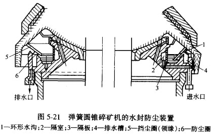 為了防止灰少進入球面軸承和傳動機構(gòu),破碎機設有防塵裝置,如圖5-21所示。在球面軸承的外緣有一環(huán)形水溝1,水在壓力作用下,沿水管進入閑空2,然后通過隔板3上的許多小孔進入環(huán)形水溝,并保持一定的高度,多余的水則從環(huán)形水溝攫至環(huán)形排水槽4的排水管流出。在動錐下部邊緣上有碗形擋塵圈5(亦稱領緣),碗形擋塵困的自由端插在環(huán)形水溝中,用它將灰塵擋入水中并隨水排出,在排水溝的外側(cè)還裝有一層橡皮防塵田6,它與動錐下部碗形擋塵困的外側(cè)相接觸,由于防塵圈是橡膠的,所以動錐無論如何擺動,此防塵團始終與碗形擋塵團接觸,這樣可將大部分粉塵隔除,起到了第一道防塵作用,減輕了水封防塵的負擔,從而更保證了設備的安全運轉(zhuǎn)。