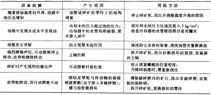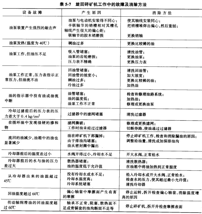 旋回破碎機(jī)主要易磨損件的使用壽命和最低儲備量可參見表5-6;旋回破碎機(jī)工作中產(chǎn)生的故障及其排除方法可參見表5-7。