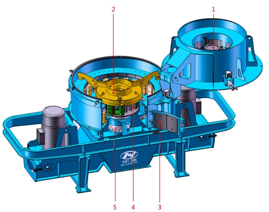 1.PLS系列立式?jīng)_擊破碎機進料斗內(nèi)部高度可調(diào)的閘門與分料盤配合液壓驅(qū)動的閘板,可以實現(xiàn)中心進料與窗口分流之間比例的精確控制,從而實現(xiàn)對出料的調(diào)整。(選配)