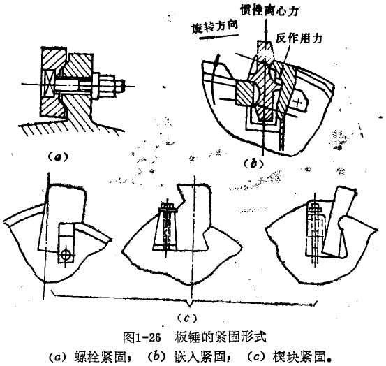 2.嵌入緊固法:扳錘從轉(zhuǎn)子側(cè)面軸向插入轉(zhuǎn)子的相應(yīng)槽孔內(nèi),為了防止軸向竄動(dòng),兩端采用壓板定位如圖1-26(5)。這種緊固方式利用板錘回轉(zhuǎn)時(shí)產(chǎn)生的離心慣性力與撞擊破碎時(shí)的反力自鎖緊固,易磨損件又便于更換。