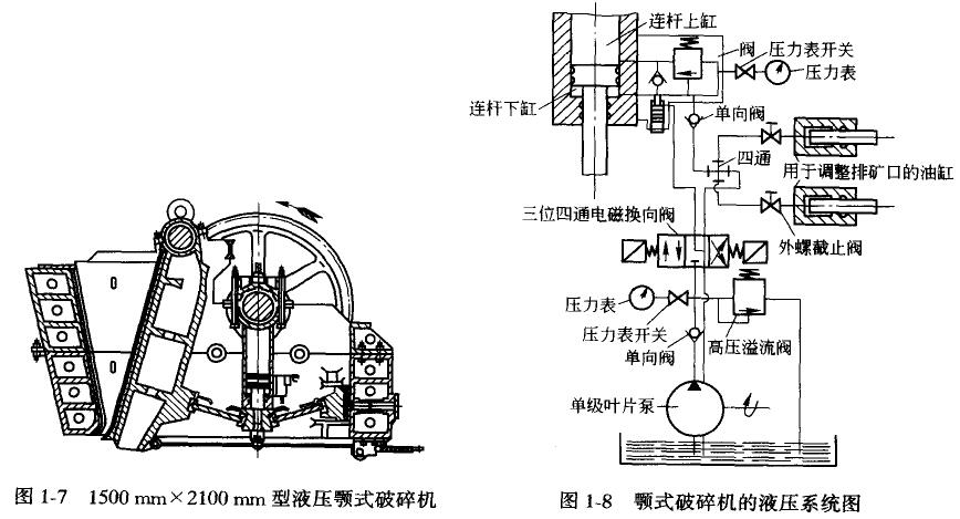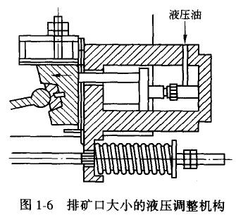 (3)液壓調(diào)整裝置。液壓調(diào)整裝置如圖1-6所示:在調(diào)整前,應(yīng)先松開連接滑塊座與后機架間的螺帽及彈簧拉桿的螺帽,再啟動液壓油泵,向油缸中注油,使油缸恬塞推動滑塊座向前移動,然后在滑塊座與后機架間增減墊片,以達到調(diào)整排礦口的目的。調(diào)整完后將油缸中的油排出,擰緊滑塊座與后機架間的螺帽,并重新調(diào)整鎖緊彈簧的螺帽。排礦口調(diào)整的液壓系統(tǒng)見圖1-8。