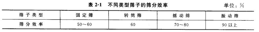 篩子運(yùn)動方式對篩分效率有較大的影響,不同類型的篩分設(shè)備,其篩子運(yùn)動方式不同,其篩分效率亦不同。同一種固體廢物采用不同類型的篩子進(jìn)行篩分時,其篩分效率大致如表2-1所示。