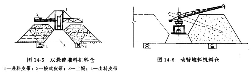 (3)堆料式料倉(cāng)。堆料機(jī)是可以沿軌道移動(dòng),有懸臂擴(kuò)大堆料范圍的專(zhuān)用機(jī)械。雙懇臂堆料機(jī)如圖14—5所示。動(dòng)臂堆料機(jī)如圖14—6所示,動(dòng)臂可以旋轉(zhuǎn)和仰俯(變幅范圍在土16°之間),能適應(yīng)準(zhǔn)料位置和堆料高度的變化,避免骨料躍落過(guò)高,產(chǎn)生遜徑。