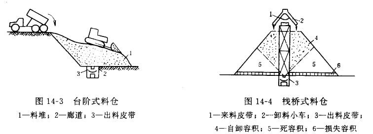 (2)棧橋式料倉(cāng)。圖14—4所示,地面亡架設(shè)棧橋.棧橋頂部安裝有皮帶機(jī),經(jīng)卸料小車(chē)向兩側(cè)卸料。料堆里長(zhǎng)條形,中廊道內(nèi)的皮帶價(jià)出料。這種利用棧橋堆料的方式,可以增大堆料高度(可達(dá)9一15m),減少料堆占地面積。但骨科跌落高度大,易造成遜徑和分離,間且料堆自卸容積(位十骨料自然休止泊斜線中間的容積)小。
