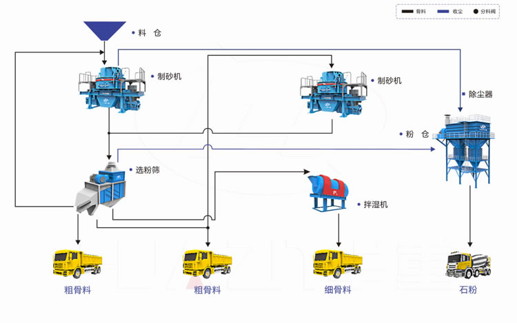 | 主要設(shè)備配置 | 制砂機(jī),選粉機(jī),空氣篩,拌濕機(jī),斗提機(jī)、除塵器。 | |||||