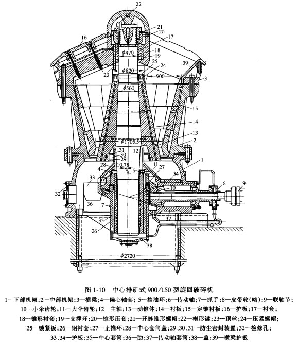 圖1—10是國(guó)產(chǎn)的900/150型中心排礦式旋回破碎機(jī),它由機(jī)架、偏心抽套、主軸和動(dòng)錐、懸掛裝置及傳動(dòng)機(jī)構(gòu)等部分所組成。