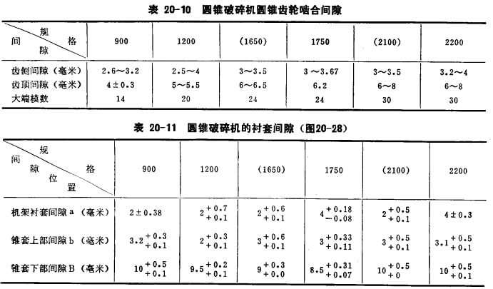 安裝旋回式破碎機和圓錐破碎機偏心軸套部時,應(yīng)特別洽態(tài)調(diào)整好齒輪的嚙合性能。圓錐齒輪的接觸面積應(yīng)占齒寬和齒長的50%左右,安裝后齒頂間隙(在齒外端測量)一般應(yīng)為(0.2—0.3)m,m為模數(shù)。表20—10是圓錐破碎機的合理齒輪嚙合間隙。