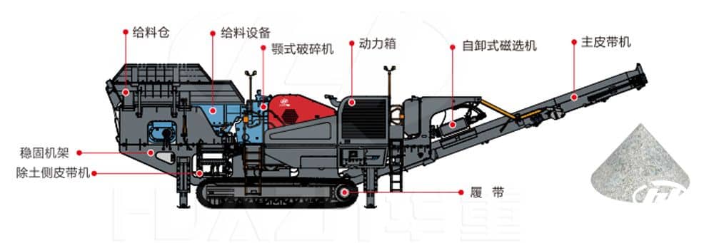 注::①關(guān)于破碎設(shè)備處理能力與石料硬度、給料粒度、出料粒度相關(guān)。②標(biāo)配:主皮帶和尾料皮帶配折疊技術(shù)、PLC+顯示器控制、除鐵器、無(wú)線遙控控制。③選配:全液壓驅(qū)動(dòng)、返料系統(tǒng)、除塵器噴淋系統(tǒng)、柴油灌注泵、有線遙控、集中潤(rùn)滑系統(tǒng)。④鑒于我公司技術(shù)不斷更新,技術(shù)參數(shù)變動(dòng)恕不另行通知,具體參數(shù)以實(shí)物為準(zhǔn)。